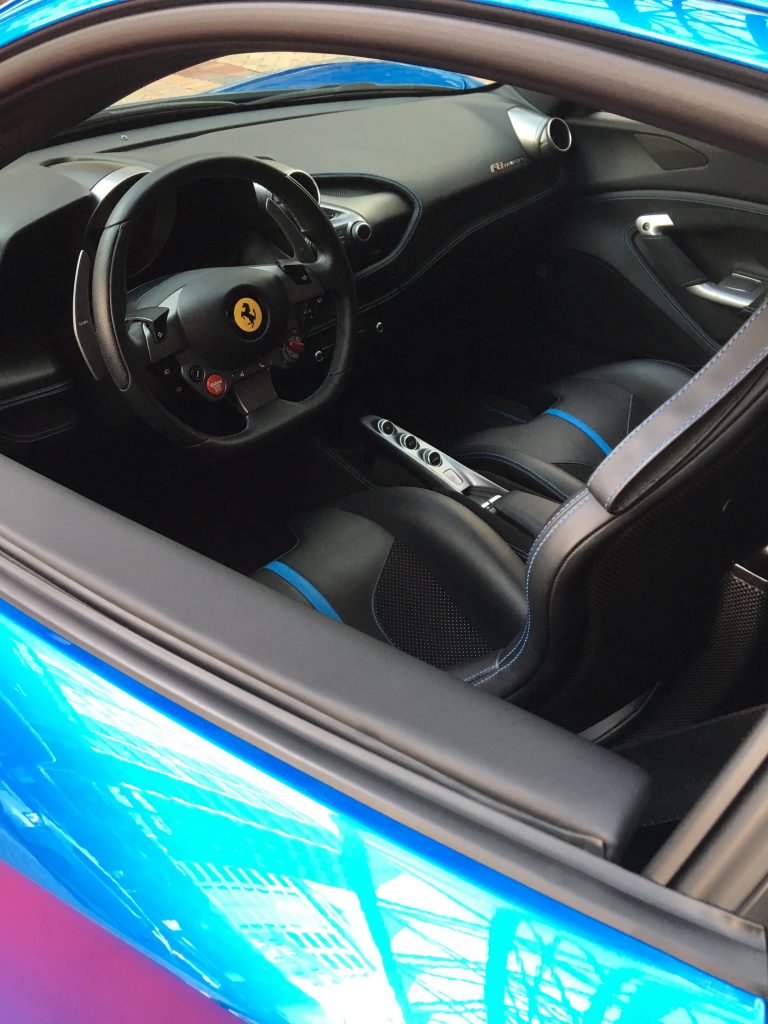Finished in special Blu Corsa exterior paint with forged glossy brilliant silver rims and yellow brake calipers, the bright shiny paintwork and specification of this Ferrari F8 Tributo drew a lot of attention.